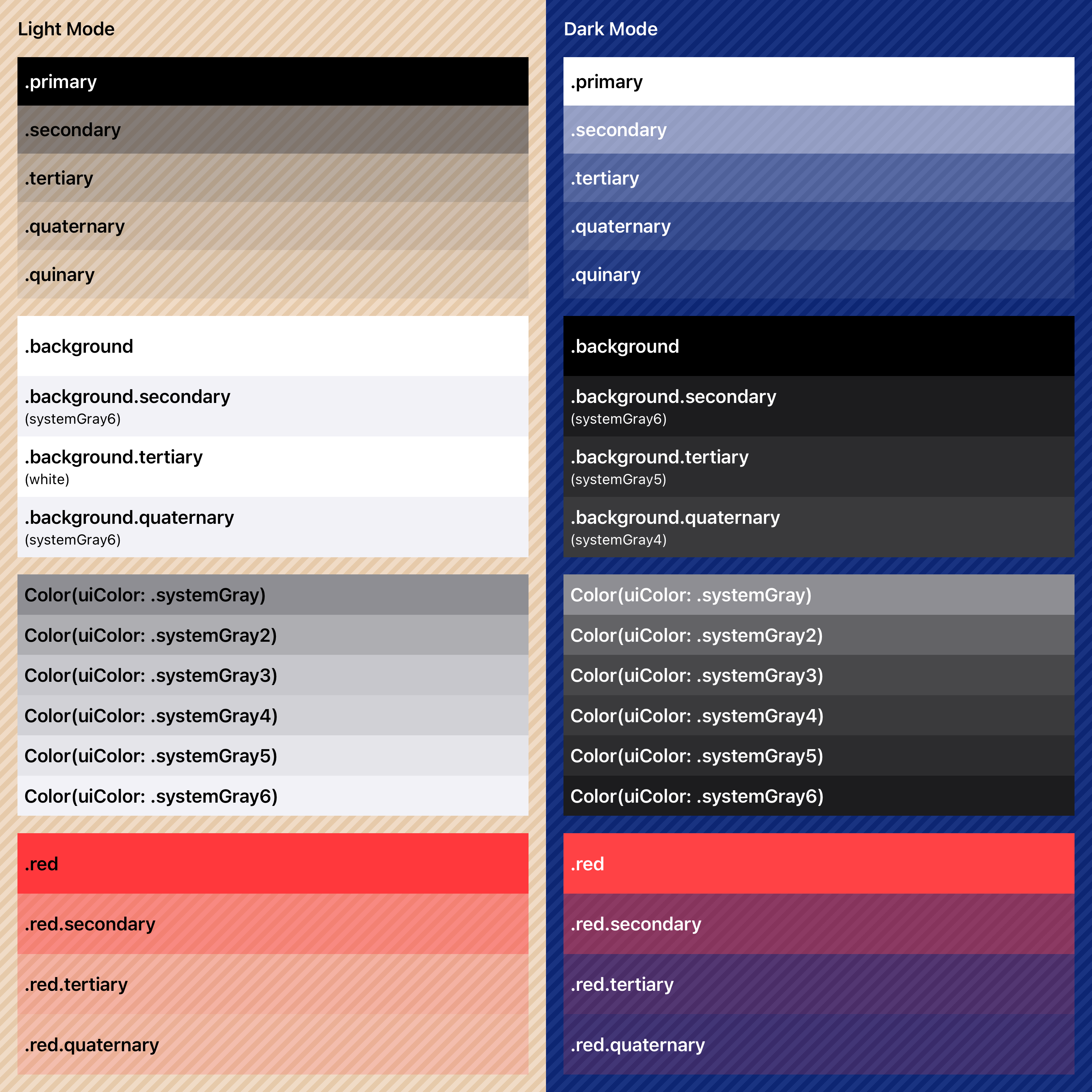SwiftUI provides a system of hierarchical colors that automatically adapt to light and dark modes. These should be used instead of hard-coded references to black/white/gray. Beware that these are transparent though. The classic UIKit .systemGray colors are included as a point of reference; also, in some cases it can be handy to refer to a specific graytone.